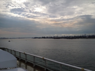 三月十一日我终於達上了这膄極大的郵轮,一点左右便来到Harbour Front 码頭,人山人海,不过還好有接待员指示要去那个柜台check in,辦好一切的手續也要等一个小时才能进去,一进到大廳就有很多的接侍员等着我们去喝免费的香槟或果汁。